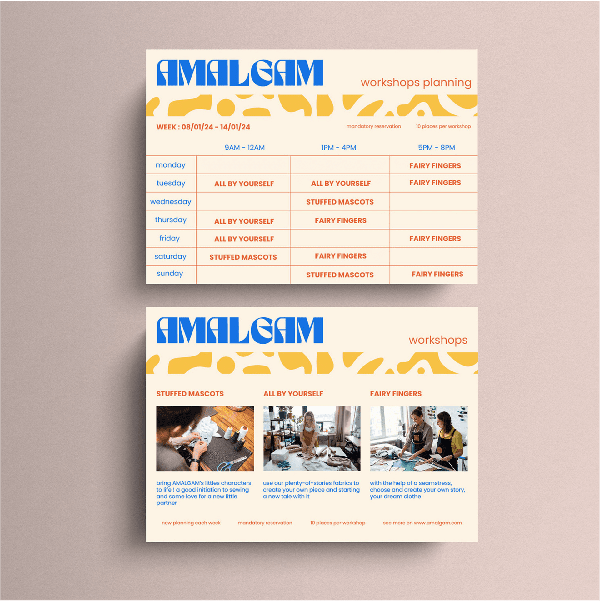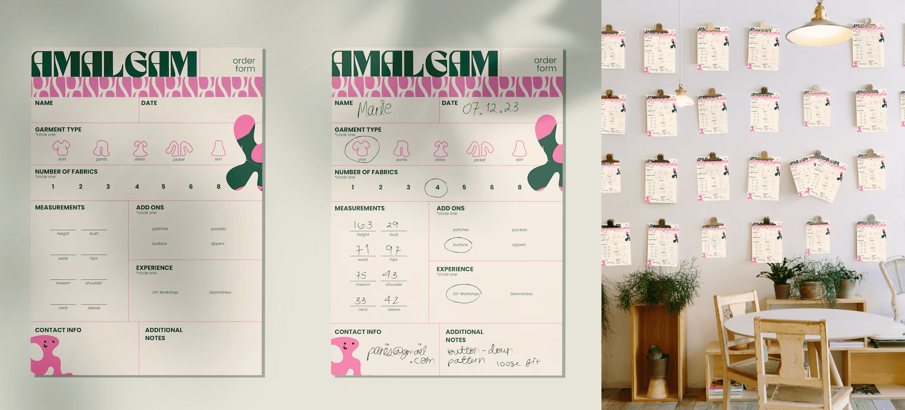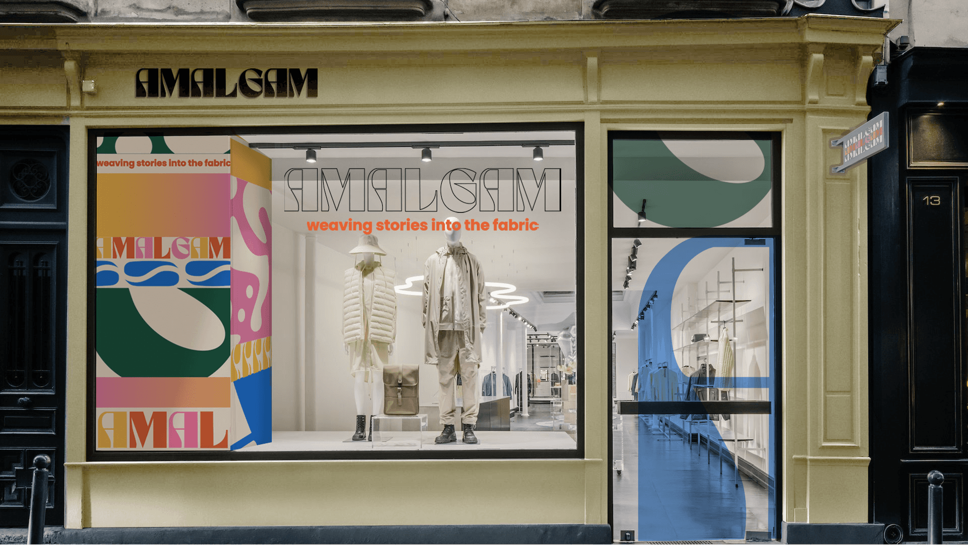 For this project, we were required to create the complete visual identity of a fictional streetwear brand. AMALGAM is a brand focused on community and textile recycling to create new garments. In the store, customers can purchase pieces from a seasonal collection or select fabric pieces to create a custom-made garment. In addition, to bring the community together, the store will offer a café/lounge area as well as several sewing workshops.