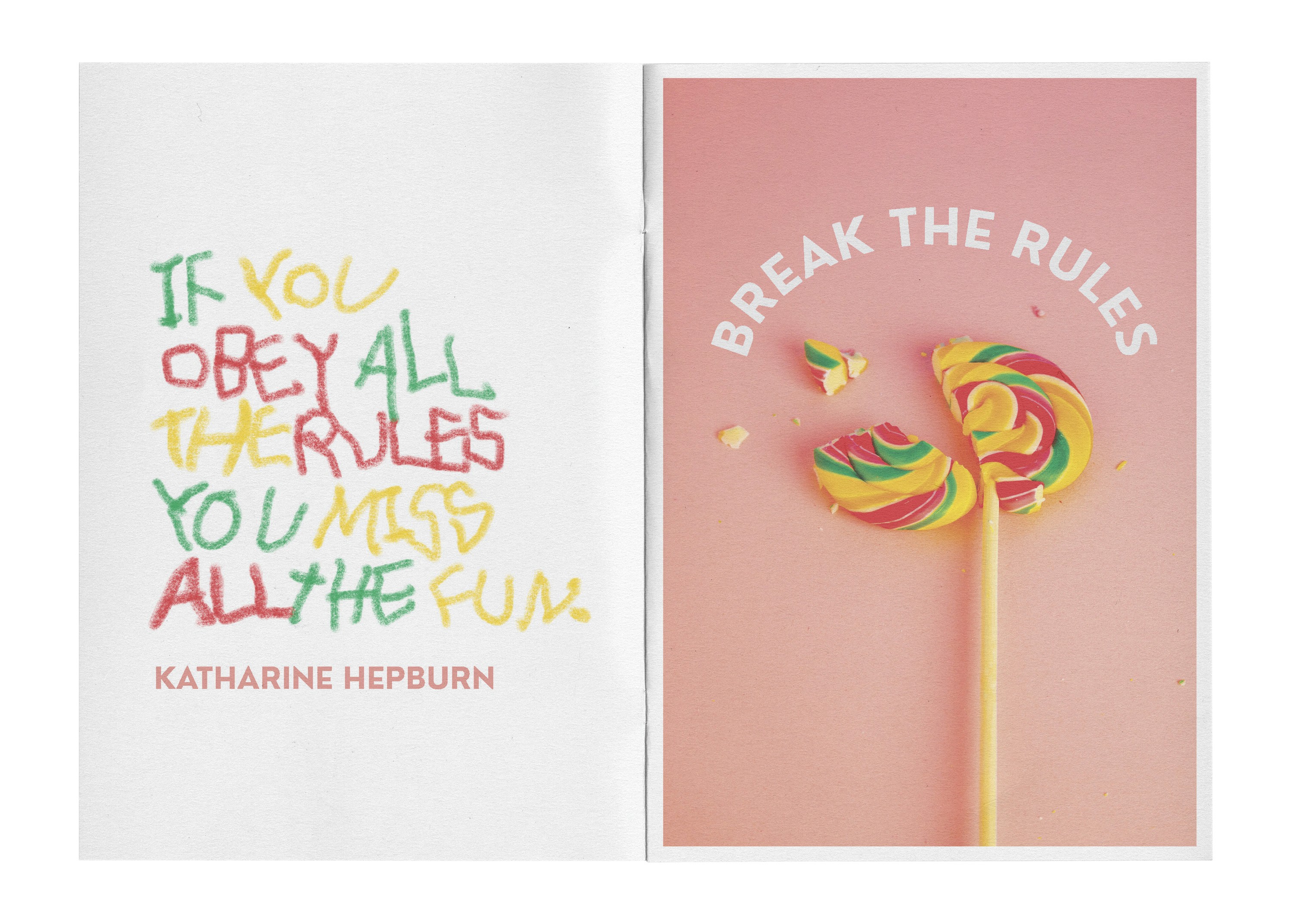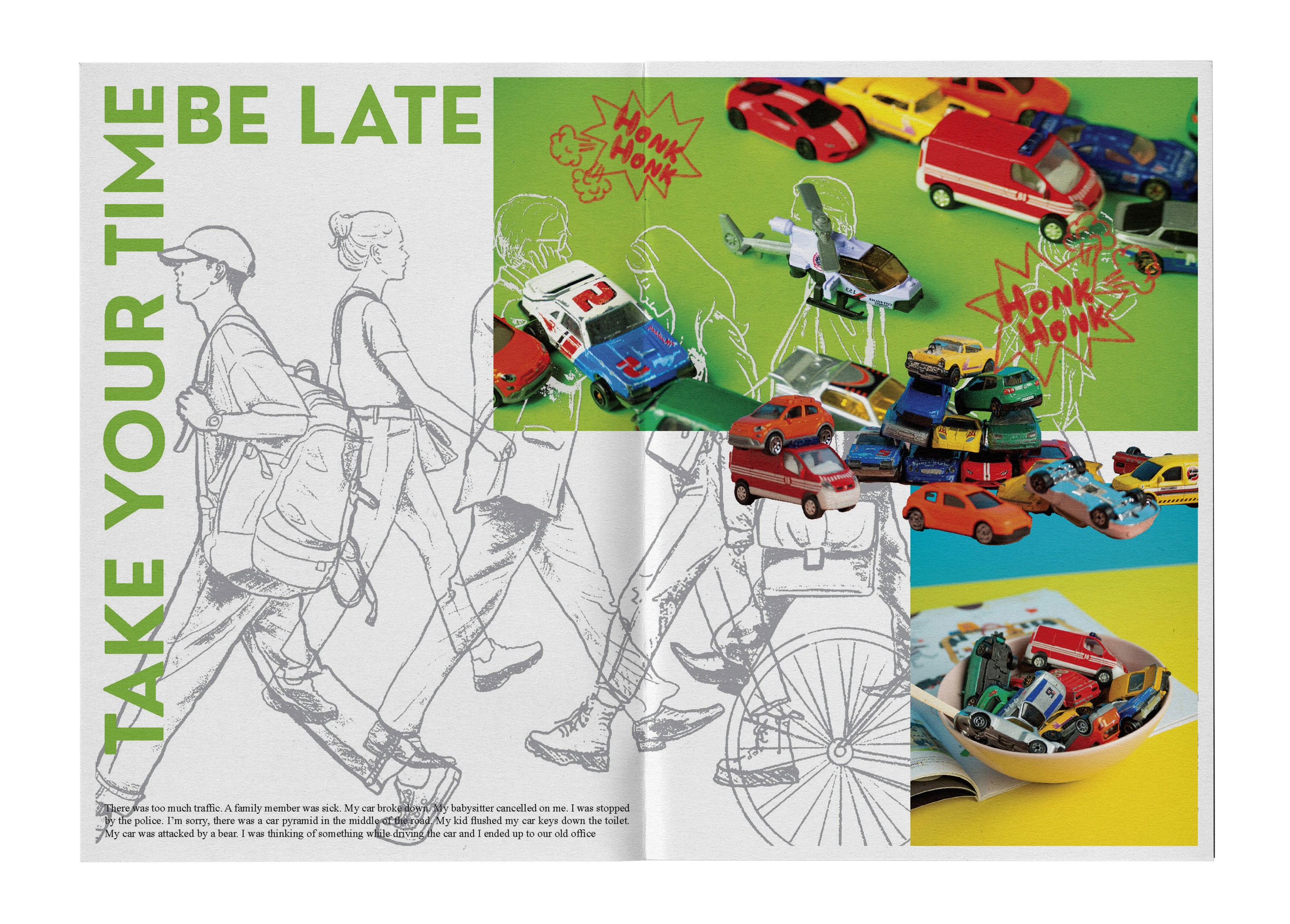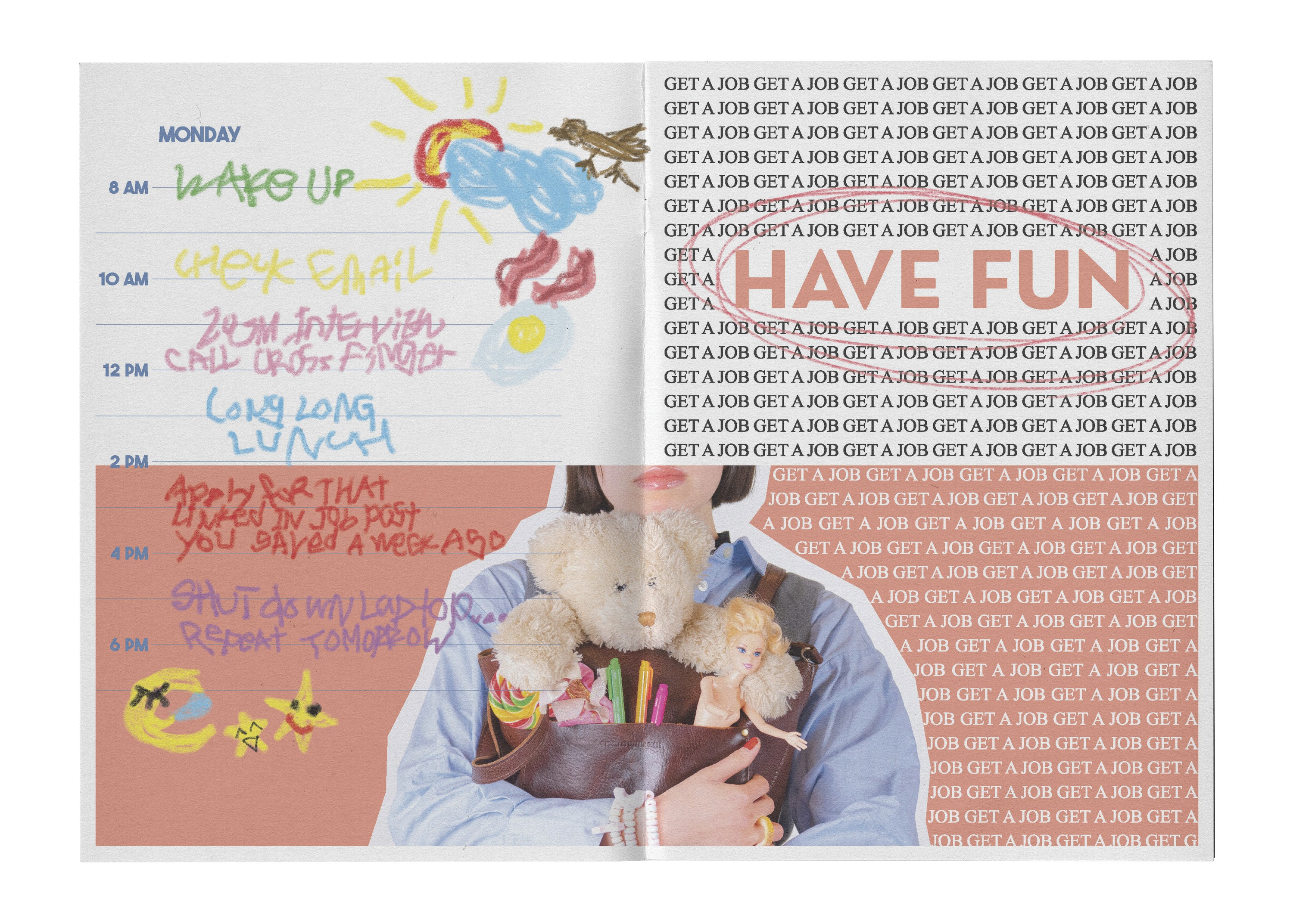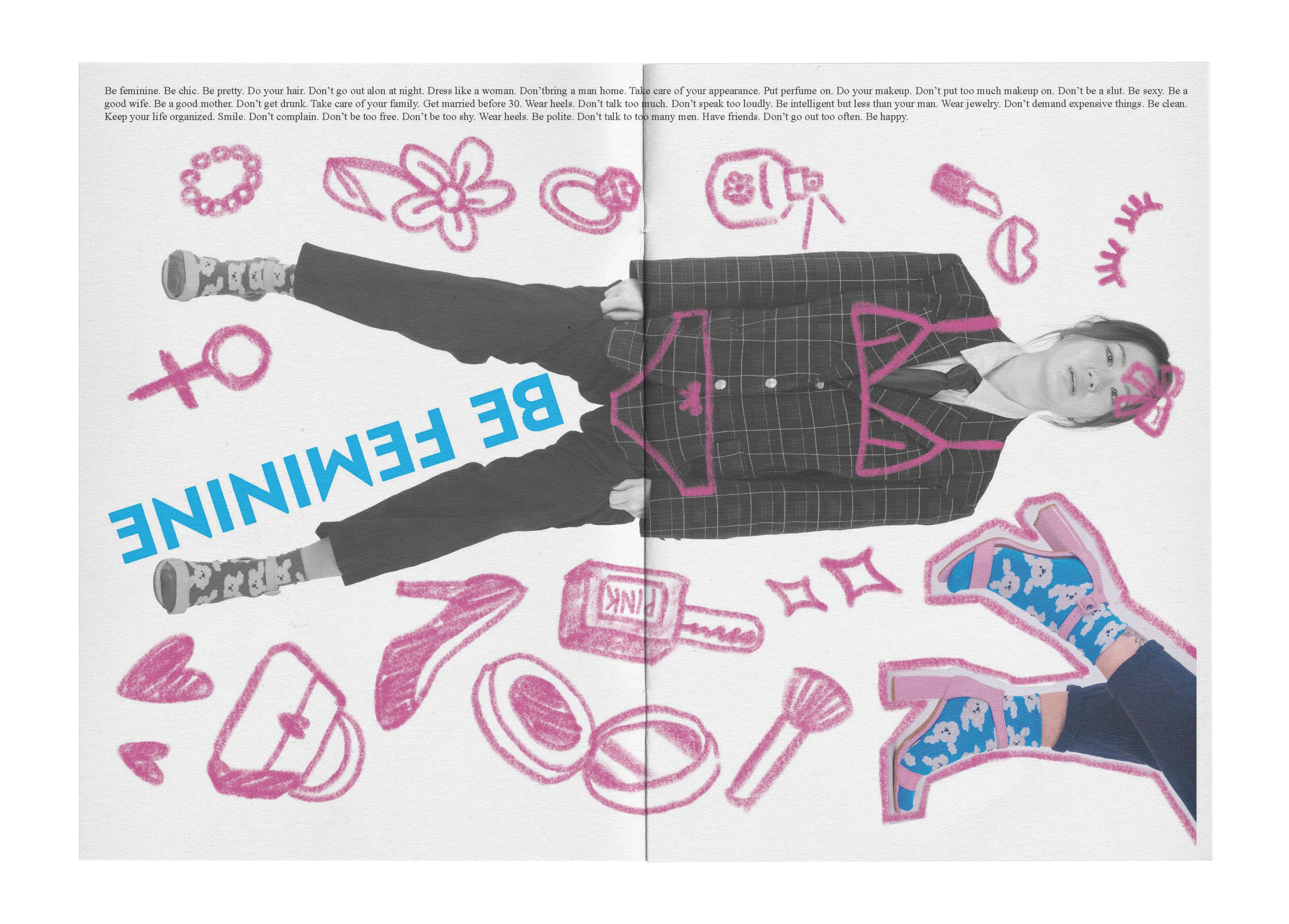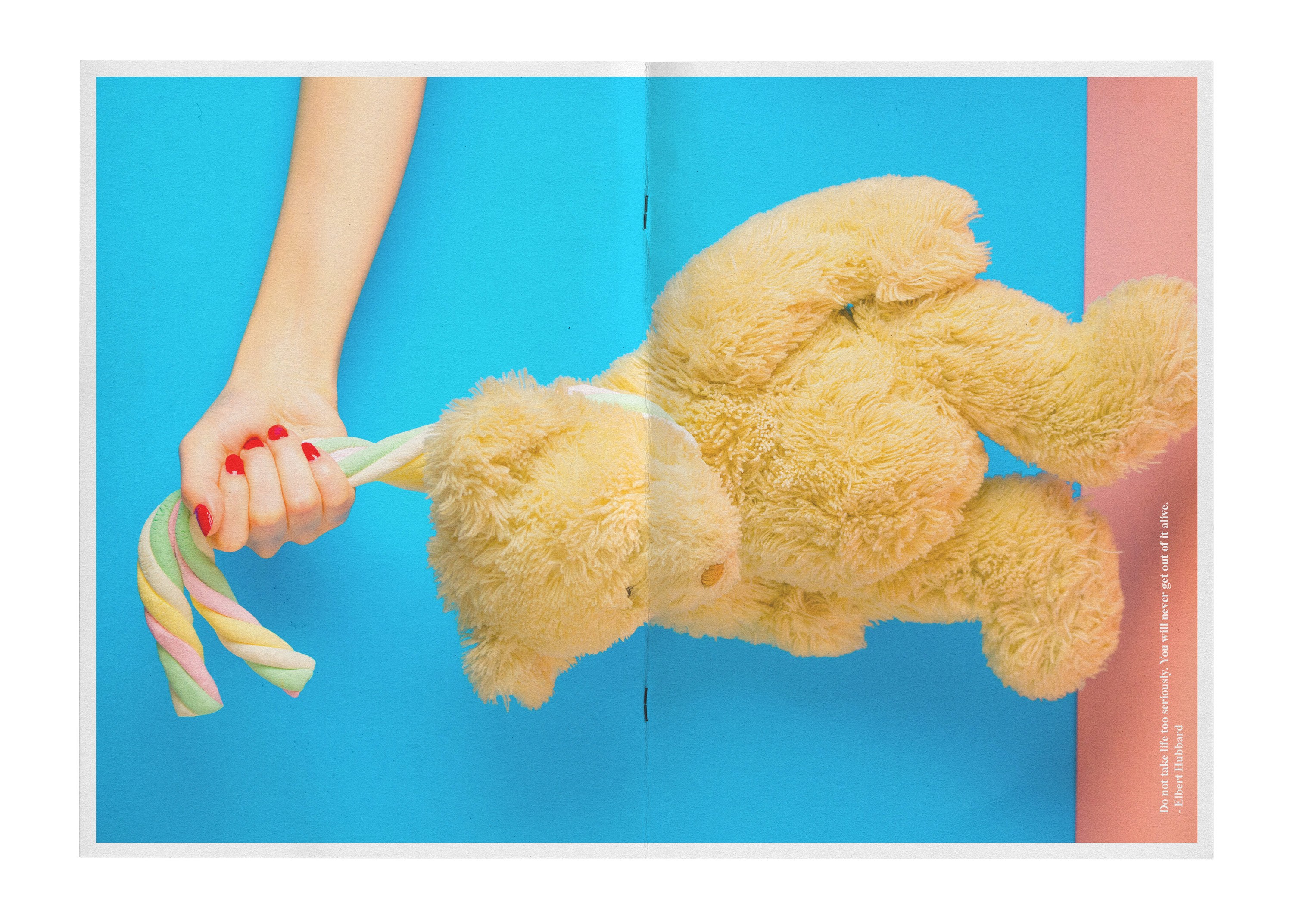 Strategies to Keep Your Inner Child Alive is a zine project rooted in the shared, universal experience of childhood, explored through a personal and political lens. Inspired by nostalgic memories that transcend geography and generations such as toys, games, and school-life rituals. The project reflects on what we lose as we grow up under societal pressures to be productive, disciplined, and “proper,” particularly as adult women. Shifting away from a purely nostalgic or cynical take, the concept evolved into a playful reclaiming of curiosity, joy, and light-heartedness by reimagining adult activities with a childlike spirit. Through vibrant still lifes and performative model shots, exaggerated props, saturated colors, encouraging copy, and a deliberately clumsy, scrapbook-style layout featuring doodles, childlike writing, and bold, sweet typography, the zine celebrates play as both resistance and release. The final outcome embraces spontaneity and imperfection, positioning playfulness not as something we outgrow, but as something worth actively preserving.